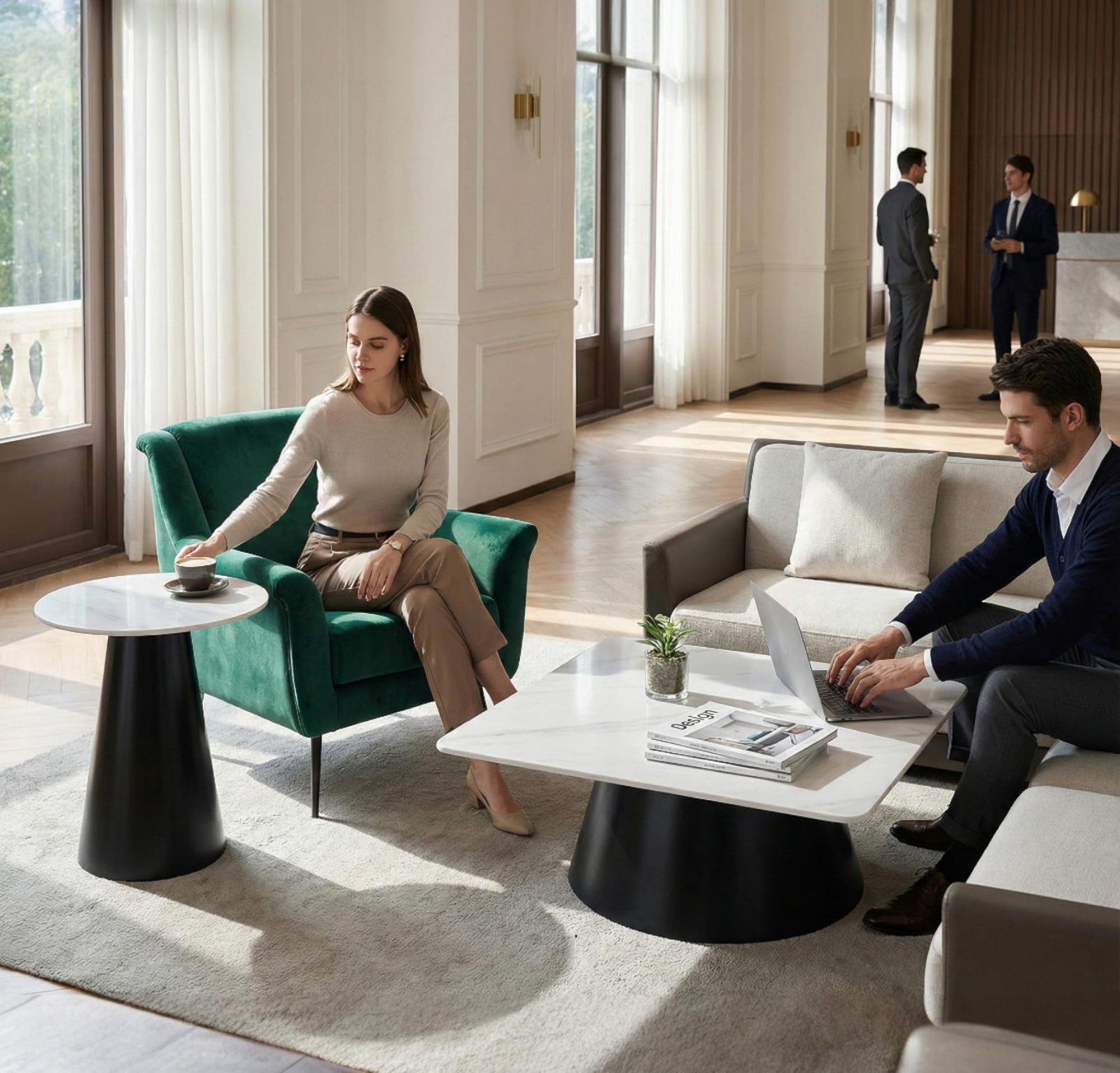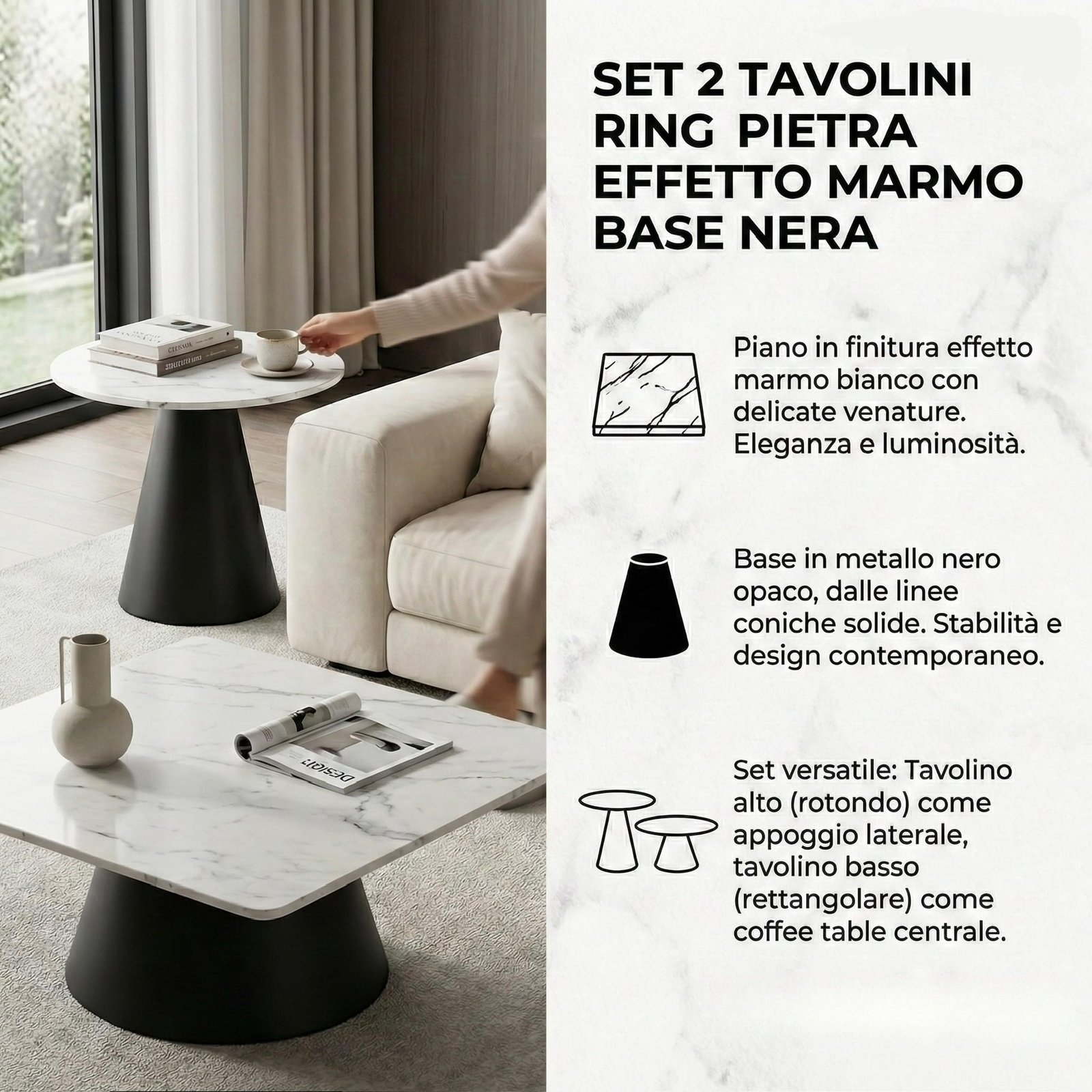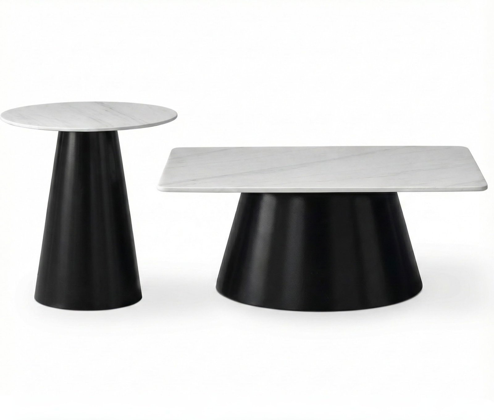 Il piano in finitura effetto marmo bianco con delicate venature dona eleganza e luminosità, mentre la base in metallo nero opaco, dalle linee coniche e solide, garantisce stabilità e un impatto visivo contemporaneo.