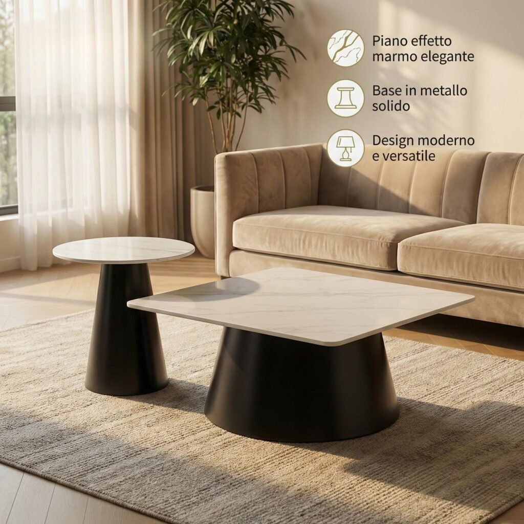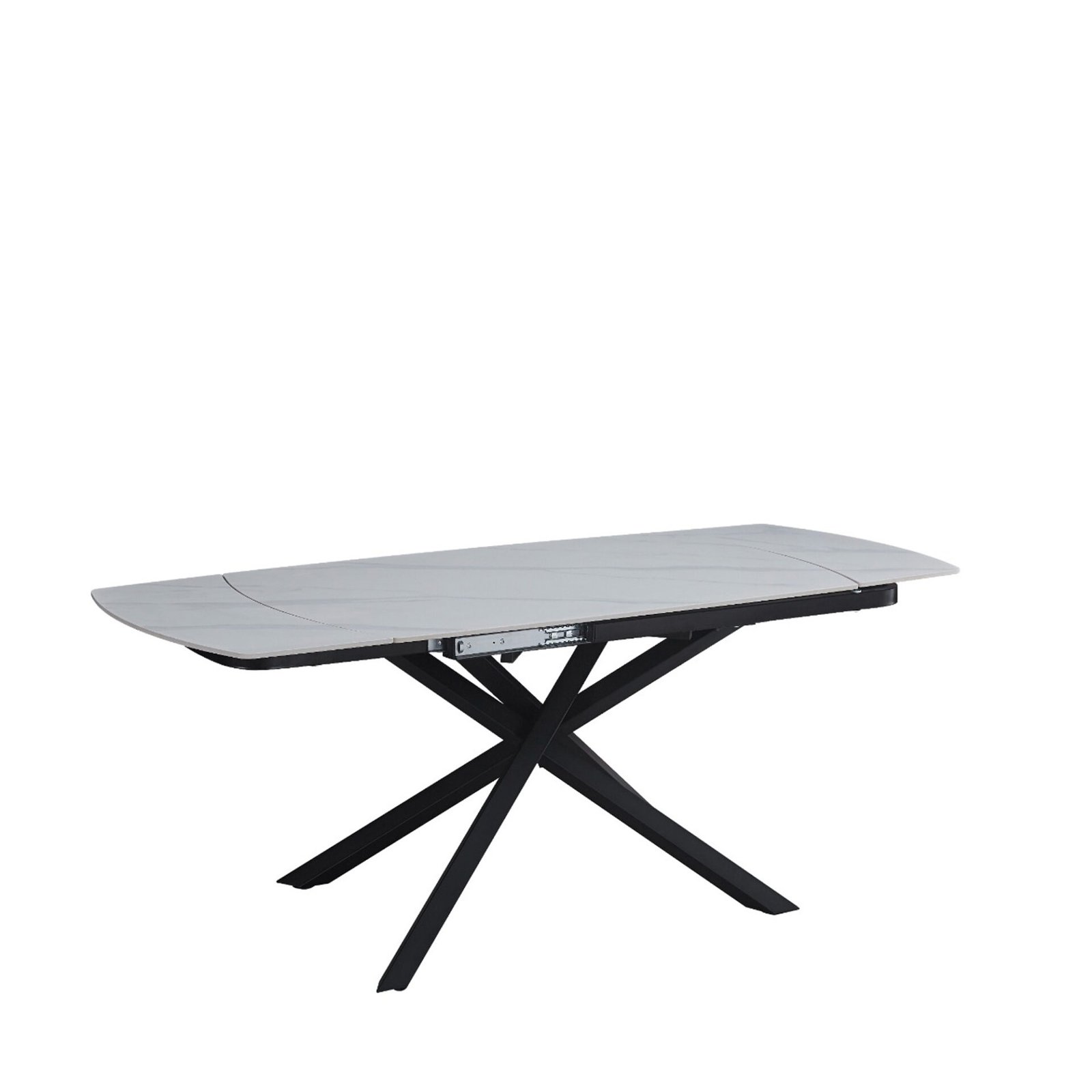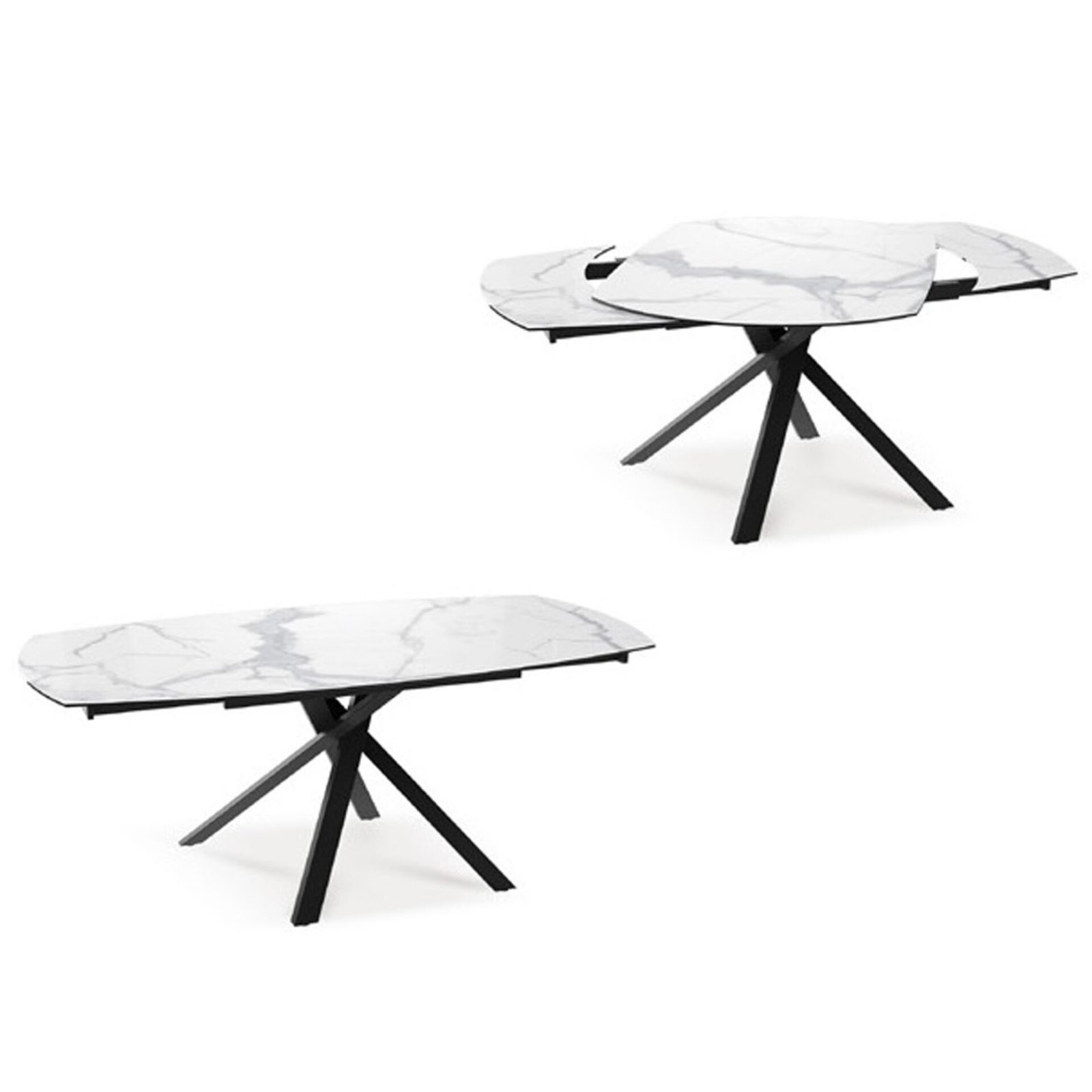 Tavolo Allungabile con Sistema di Estensione Rotante, Il piano in gres porcellanato finitura opaca, effetto marmo, dona un tocco elegante e luminoso, garantendo al tempo stesso